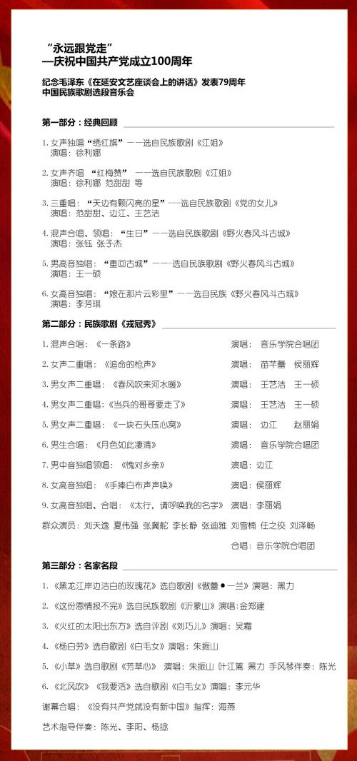 演唱会曲目安排紧扣“永远跟党走”的主题,划分为三个部分: