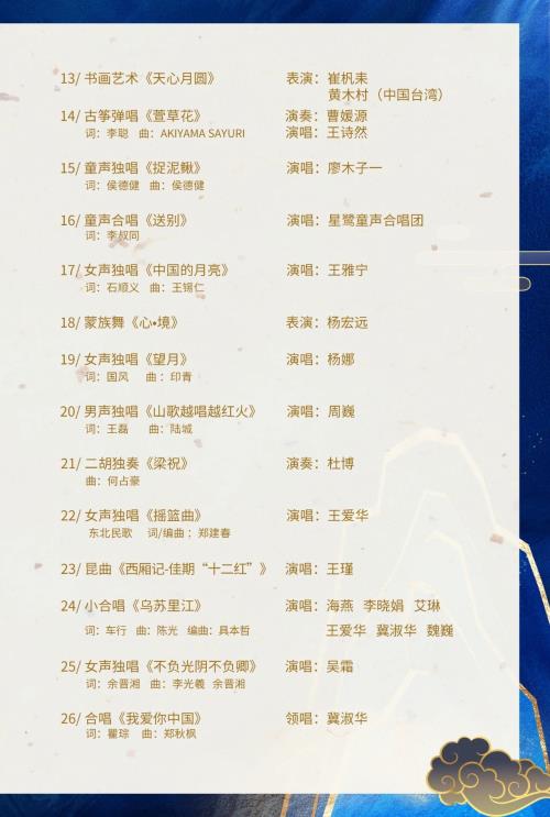 周巍、王雅宁、左梅、杨娜、刘郎、王爱华、艾琳、唐小向、魏巍、徐栩、徐铭鸿等艺术家为晚会献上了各自的歌声。王天阳的钢琴独奏、周子雷的陶笛、曹媛源的古筝、杜博的二胡、王瑾的昆曲、杨宏远的蒙族舞,在中秋团圆的大主题下,尽情挥洒。全国各地观众通过视频观看了演出,纷纷以“弹幕”表达点赞和祝福。