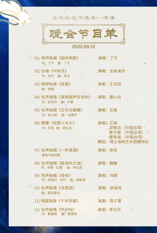 中秋佳节,团圆吉日。本场晚会也受到了台湾同胞的关注。由于疫情影响,中国台湾演员无法来到现场献唱。海峡两岸校园歌手大赛的优胜选手,来自中国台湾的茆致远、曾令瑜、楼季涵录制了视频,给晚会送来了祝福。楼季涵演唱了《但愿人长久》。