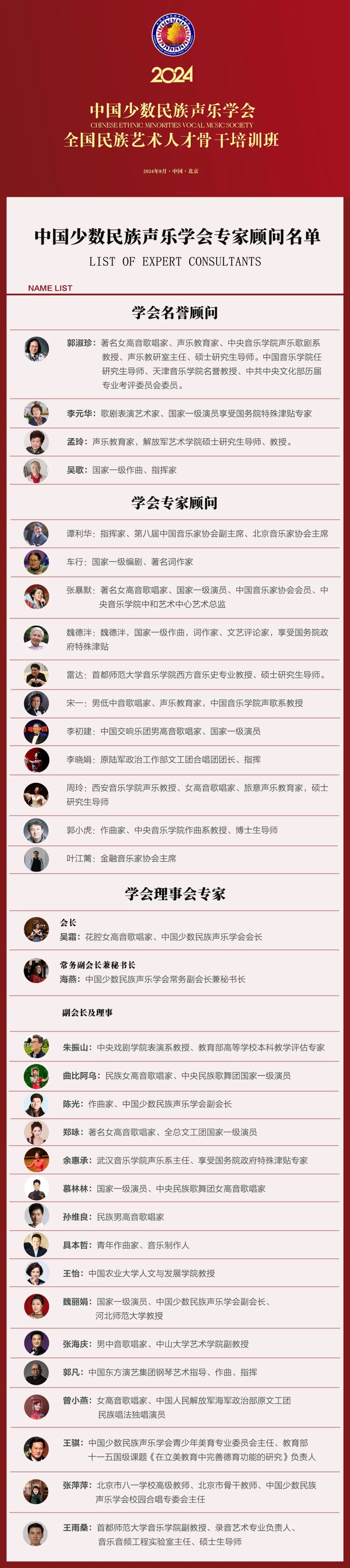 2024年中国少数民族声乐学会全国民族艺术人才骨干培训班即将在8月开展,为了认真贯彻“百花齐放、百家争鸣”、为各族人民服务、为新时代中国特色社会主义服务的文艺方针,并有效传承与弘扬中华优秀文化,本次人才骨干培训班汇聚业内顶尖的师资力量,通过系统的理论学习和实践训练,打造一个集教学、实践、交流于一体的综合性平台,专注于民族音乐表演、教育、文化传承与保护等领域,致力于培养一批既精通传统艺术精髓,又具备现代艺术视野和创新能力的骨干人才,传承、弘扬、发展我国多民族艺术文化,努力为筑牢中华民族共同体意识做出贡献。